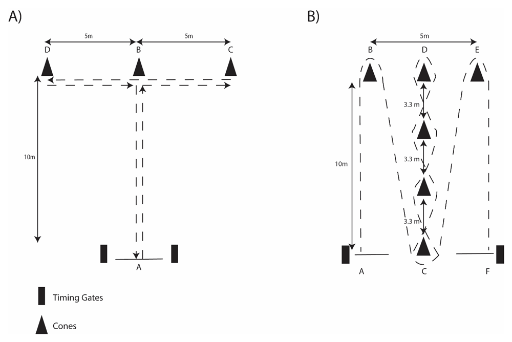 Assessment of speed was achieved by completing 30-m maximal sprints, the Agility T-test protocol was set up within a 10-m × 10-m figure-T course (Figure 2A), and the Illinois Agility protocol consisted of a 10m × 5m course (Figure 2B)3. To ensure protocol familiarity, the participants completed three trials at sub-maximal effort followed by one final maximal trial, with each trial interspersed by two minutes of recovery. Trial completion times were recorded using an electronic timing gate system (Speedlight Timing Gates, Swift Performance, Australia) positioned at the start/finishing line. The fastest time was used for later analysis.