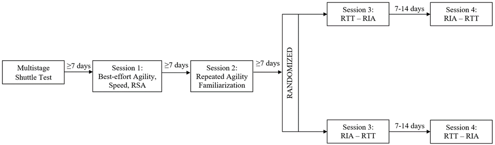 The current study was a randomised, counter-balanced study conducted across five sessions from June, 2018 to August, 2018 (Figure 1). During the first session, the participants completed a Multistage Shuttle test to determine predicted maximal aerobic capacity (VO2max)14. The second session was utilised to obtain baseline assessments of speed (30-metre sprint), COD (Illinois Agility test, Agility T-Test) and repeat-sprint ability (RSA). The third session familiarised participants with the RTT and RIA tests. During the fourth and fifth sessions, participants undertook both the RIA and RTT, in randomised order, with at least 15-minutes of recovery between each protocol.