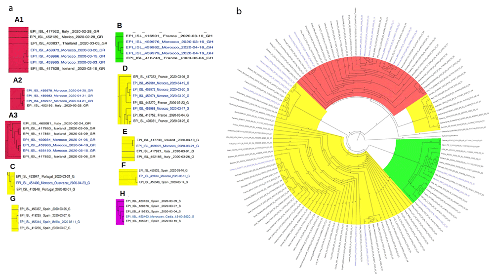(a) Maximum likelihood phylogeny, constructed using complete SARS-CoV-2 genomes from the GISAID database. The blue sequences represent the Moroccan isolates (19), a strain isolated from Melilla and a strain isolated from a Moroccan patient in Cadiz, Andalusia. The phylogenetic tree is divided into four clades: the red part for the GR strains, the green one for the GH strains, the yellow one for the G strains, and the pink one for the S strain. This Figure represents selected sub-tree extracts from the extended phylogenetic tree in Extended data, Figure 15. A1–3: represent clusters of Moroccan strains originated from Italy and belonging to the GR clade; B: represents a cluster of Moroccan strains from a French origin and belonging to the GH clade; C: represents the Moroccan strain isolated from Ouarzazate, it originated from Portugal and belongs to the G clade; D: represents a cluster of Moroccan strains originated from France and belonging to the G clade; E: represents a Moroccan strain that originated from Italy and it belongs to the G clade; F: represents a Moroccan strain from a Spanish origin and belonging to the G clade, G: represents the sequence isolated from Melilla belonging to the G clade with a Spanish origin, H: represents the sequence isolated from Cadiz; it belongs to the S clade and it’s close to strains from Spain. (b) Circular representation of the phylogenetic tree of a subset of 120 sequences collected before closing Moroccan international borders, constructed using complete SARS-CoV-2 genomes from the GISAID database. The blue sequences represent the Moroccan isolates (19). The phylogenetic tree is divided into three clades: the red part for the GR strains, the green one for the GH strains, and the yellow one for the G strains. The clade S containing the Cadiz sequence is absent as we removed this sequence from this phylogenetic analysis.