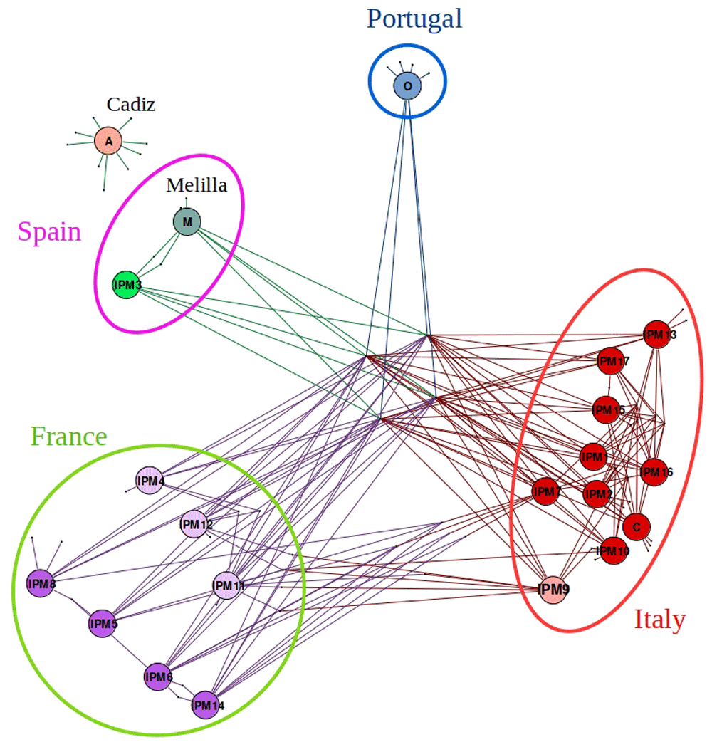 Every dot represents a sequence, and each edge on the network connects, using a shared variant, a sequence to one or more other sequences. The red circle group Moroccan sequences originated from Italy, the green one group sequences originated from France, the purple one assemble sequences originated from Spain, and the blue one represents the sequence originated from Portugal; we used different color gradients to separate sequences that belong to different clades in the same cluster. A: Strain isolated from Cadiz, it belongs to the S clade and it shares no variants with Moroccan strains, including the Spanish ones. M: represents the strain isolated from Melilla, it belongs to the G clade in a cluster of Spanish sequences. IPM3: is a Moroccan strain isolated by Pasteur Institut of Morocco (IPM), it belongs to the G clade and it’s coming from Spain. O: represents the strain isolated by LRAM from Ouarzazate, it's the only sequence with a Portuguese origin and it belongs to the G clade. IPM9: represents a sequence collected by IPM, it originated from Italy and belongs to G clade. C; IPM1; IPM2; IPM7; IPM10; IPM13; IPM15-17: represent a strain isolated by Anoual laboratory in Casablanca (C) and sequences collected by IPM, they belong to the GR clade and they all are from Italian origin. IPM4; IPM11-12: represent strains isolated by IPM, they originated from France and they belong to the GH clade. IPM5-6; IPM8; IPM14: represent strains isolated by IPM they are from a French origin and they belong to the G clade.