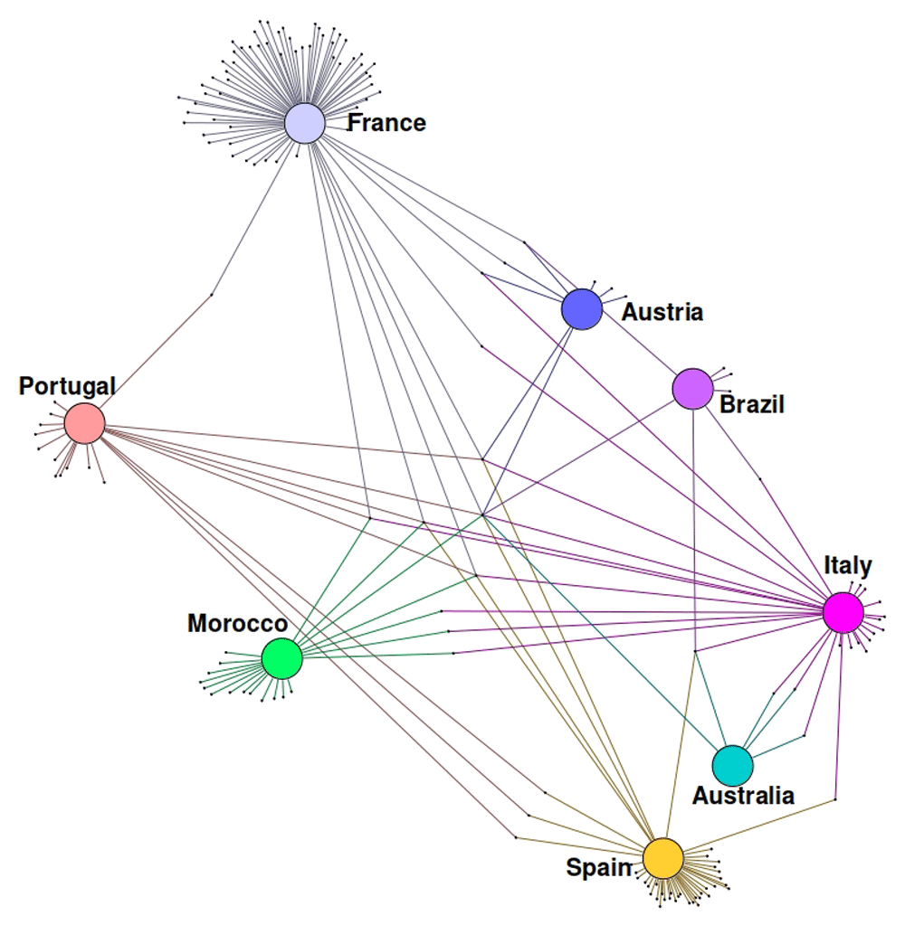Each dot represents a group of 19 sequences randomly selected from each country. The Moroccan node represents all 19 sequences isolated in Morocco. Morocco shares more variants with Italy (seven), France (four), Portugal (three) and Spain (three) than with Brazil (one), Austria (one) and Australia (one).