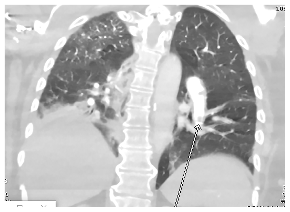 The patient was admitted and started on hydroxychloroquine 400 mg every 12 hours for two doses followed by 200 mg every 12 hours for 5 days in addition to supportive measures, including acetaminophen 650 mg as needed for fever and supplemental oxygen. The patient’s regular hemodialysis schedule was also continued during her admission. A computed tomography pulmonary angiogram Figure 1 revealed pulmonary embolism in the left lower lobe, involving segmental and proximal subsegmental arteries without right heart strain or pulmonary infarction.
