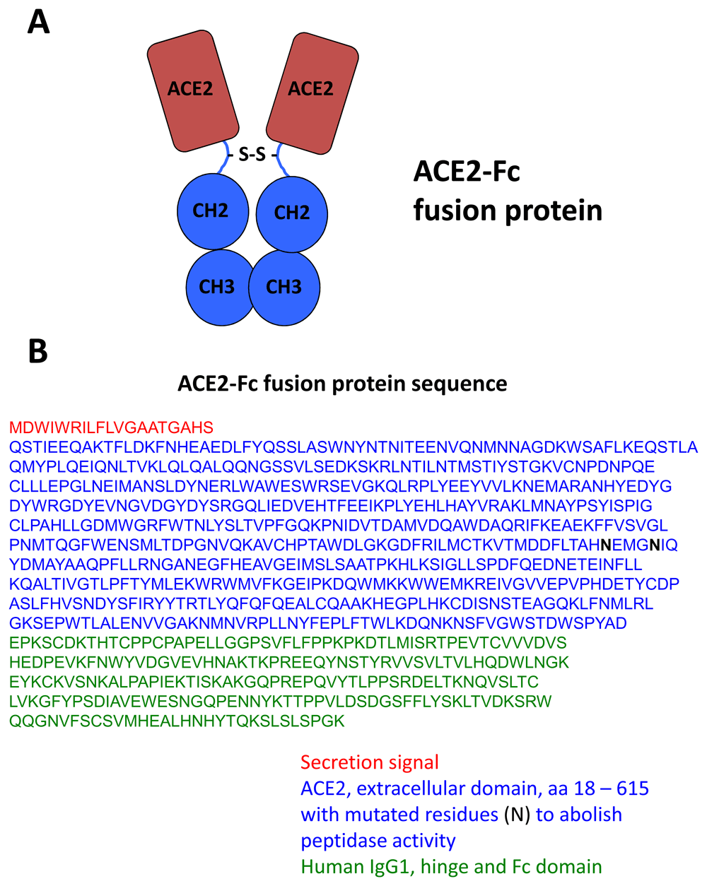 (A) The extracellular domain of ACE2 is appended onto the human immunoglobulin Fc domain, including the hinge region. The Fc domain facilitates dimerization of two ACE2 domains. (B) The amino acid sequence of the ACE2-Fc fusion protein is provided. The ACE2 domain consists of amino acids 18-615 of the human ACE2 protein (blue; UniProtKB - Q9BYF1) with mutations in residues 374 and 378, replacing histidine (H) with asparagine (N in black) to eliminate peptidase activity. The sequence of the human immunoglobulin G isotype 1 constant region is provided (green; UniProtKB - P01857). A secretion signal from a human immunoglobin heavy chain is provided (red; UniProtKB - A0A0C4DH39).