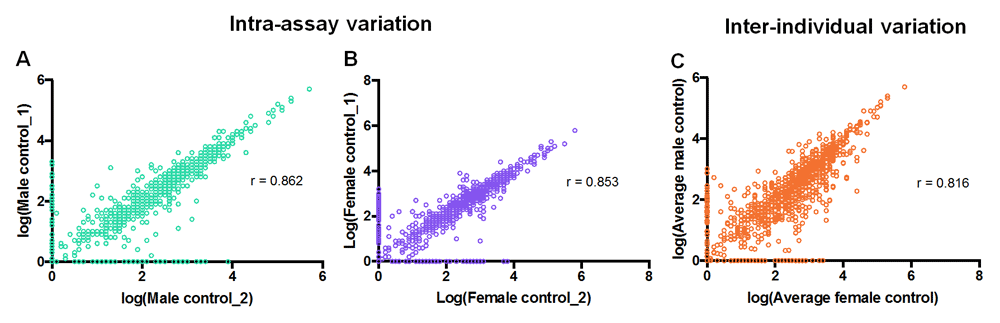 (A) Strong intra-assay correlation between the two identical male control samples (aliquot 1 vs. aliquot 2) that were assayed in a blinded fashion (P<0.001). Similarly, (B) shows strong correlation between the two identical female control samples (P<0.001). (C) Strong correlation between the average value of the two male control samples and that of the two female control samples (P<0.001). Pearson correlation coefficient (r) was used for analysis.