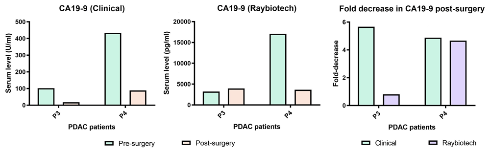 Since the Quantibody® array includes the classical PDAC biomarker, CA 19-9, we also compared the post-surgical fold change in serum CA 19-9 level reported by the clinic to those obtained from the Quantibody® array in two of the five patients, where clinical data was available (Figure 2A, B). Following tumor resection, patient 3 (P3) had a 5.7-fold decrease, while patient 4 (P4) saw a 4.7-fold decrease in CA 19-9 according to clinical assessment (Figure 2C). On the other hand, the Quantibody® array data displayed a post-surgical 0.8- and 4.7-fold decrease in CA 19-9, in P3 and P4, respectively (Figure 2C).