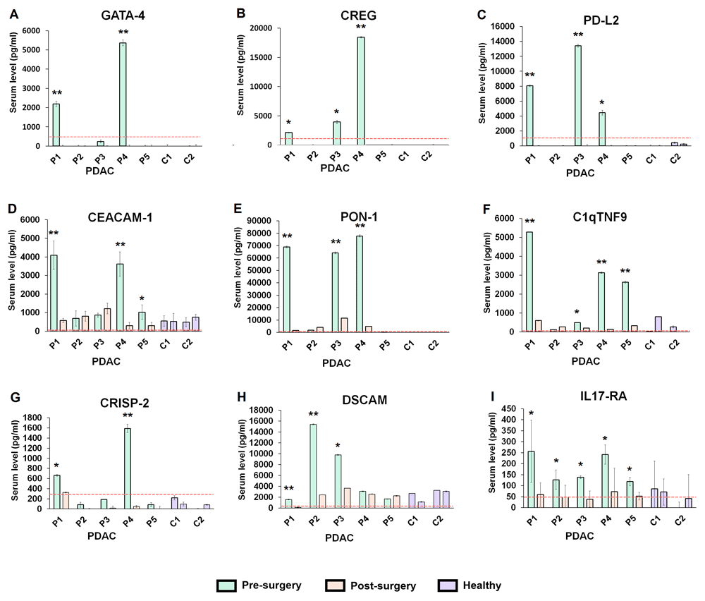 Bar graphs depict normalized serum level of proteins in five PDAC patients (P1-P5), before and after surgery, and in two controls (C1 and C2). Red dashed line depicts limit of detection. Error bars represent 95% confidence intervals based on the technical quadruplicate values. * Post-surgical decrease of at least two-fold. ** Post-surgical decrease of at least five-fold. (A–C) Levels of CREG, GATA-4 and PD-L2 dropped to undetectable levels in patients who expressed the protein prior to surgery. (D–F) PON1, C1qTNF9 and CEACAM-1 levels decreased by at least five-fold in patients who highly expressed the protein pre-surgery. (G–I) DSCAM, IL-17RA and CRISP-2 levels decreased by at least two-fold in at least two of five patients.
