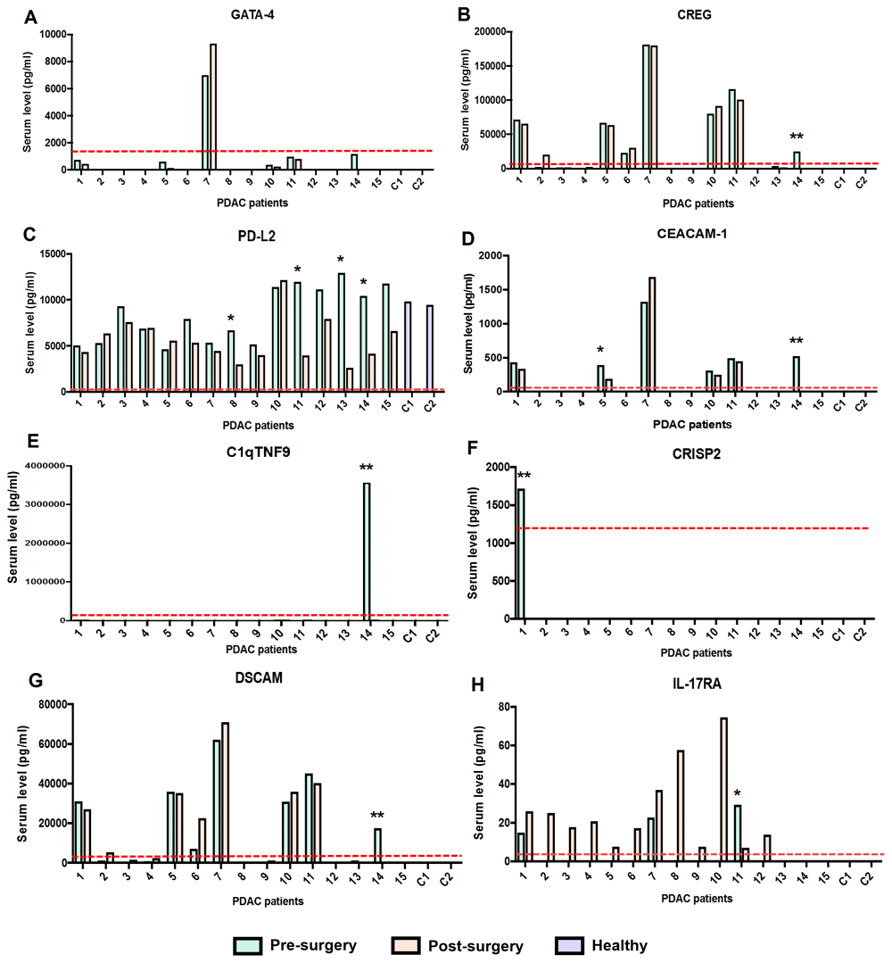 Bar graphs depict serum level of the proteins in fifteen PDAC patients (P1-P15), before and after surgery, and in two controls (C1 and C2). Red dashed line depicts limit of detection. * Post-surgical decrease of at least two-fold. ** Protein level dropped to undetectable level following surgery.