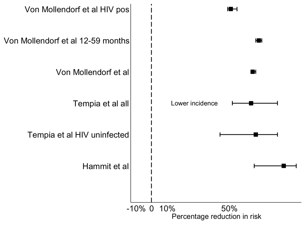 | Tempia et al., 201533 | HIV uninfected | -- | -- | 66.8 (43.8 – 81.3) |