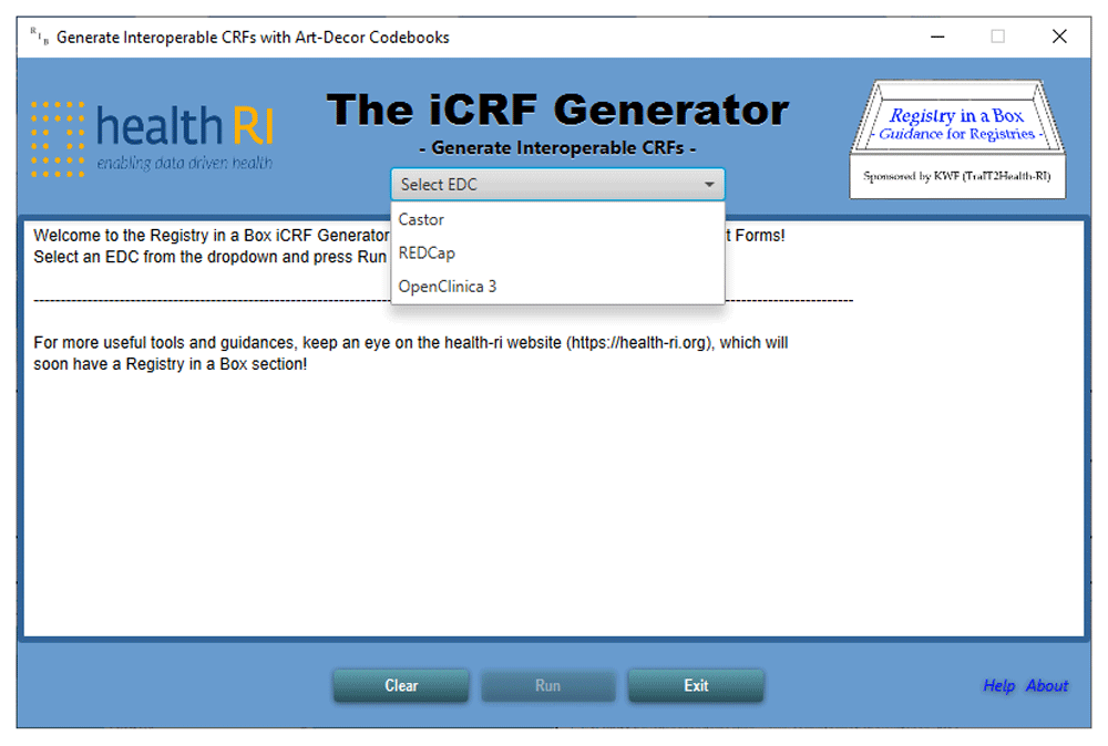 A typical use case for the iCRF Generator is in the design phase of a study or registry. When a decision has been made on what clinical data is going to be collected, the data manager has to design and build the CRFs for data collection. Instead of doing this manually, the iCRF Generator can be used to select items from the available codebooks and generate the basis of the case report forms. Figure 1 illustrates the iCRF Generator’s complete workflow. In a typical use case, the user first selects an EDC from the dropdown (Figure 2). The user then clicks the “Run” button, after which the wizard interface is started. The first wizard page asks the user to select one or more codebooks (Figure 3). When a user has selected a codebook and presses the “Next” button, a REST-call is made to retrieve an XML which contains which versions and languages are available for the codebook. The second page shows this information to the user, allowing selection of the versions and languages of interest (Figure 4). When the user proceeds to the next page, the selected codebooks are retrieved via one or more REST-calls. These XML files are parsed and the information it contains about the items and their possible values is shown on the third page (Figure 5). This EDC-specific page allows users to select and customise the items that have to be included in the CRF. The final page of the wizard shows a short summary of the number of selected items. Upon completion of the wizard, the program generates the CRF in the format required by the selected EDC and the file is saved to disk. This file can then be imported into the EDC-system or opened in an editor of choice.