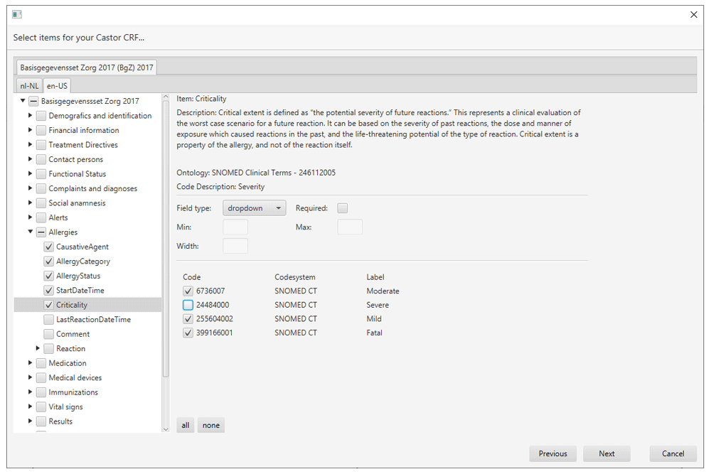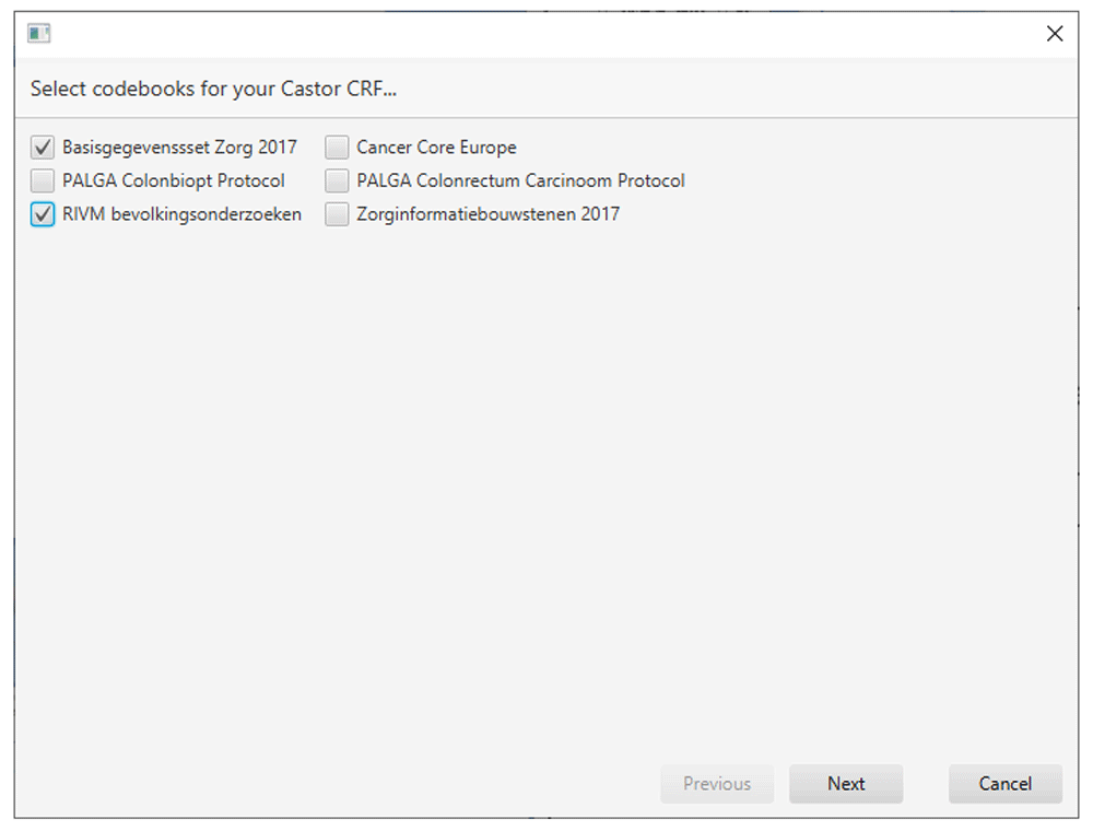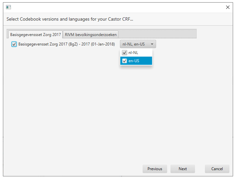 Some of the codebooks are available in English, as well as Dutch. Other codebooks may be made available in the iCRF Generator in the future when they become available in ART-DECOR provided they are of sufficient quality and are complementary.