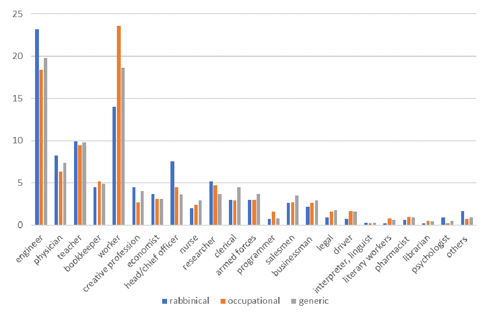 We also calculated the occupational distribution of all the surnames, i.e. general Russian-speaking Jewish families, which is of its own interest. We demonstrated that the distribution is very similar to that of bearers of generic surnames. This indicates that, despite differences between generic, rabbinical and occupational surnames being pronounced, they average out in the distribution of the general population. This is both because the deviations of the occupational preferences of bearers of rabbinical and occupational surnames from those of generic surnames are often opposite and because those groups are not as many. Thus, in our pool, rabbinical and occupational surnames constitute 20.5% (1915 individuals) of the total, where 9.2% are rabbinical surnames.