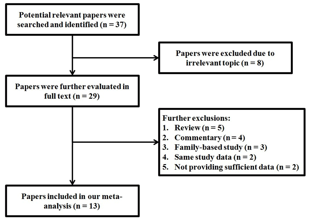 A flowchart of article searches and study selection is shown in Figure 1. Initially, 37 articles were identified from the literature search. However, eight of them were excluded because they did not have relevance to the topic, leaving a total of 29 articles. The full text of these articles was retrieved and reviewed; it was found that 16 studies did not meet the eligibility criteria because they were reviews (n=5), commentaries (n=4), family-based studies (n=3), included the same study data (n=2), and not providing sufficient data for calculation of OR and 95%CI (n=2). Finally, a total of 13 studies were eligible for our meta-analysis. Baseline characteristics of studies included in our analysis are provided in Table 1.