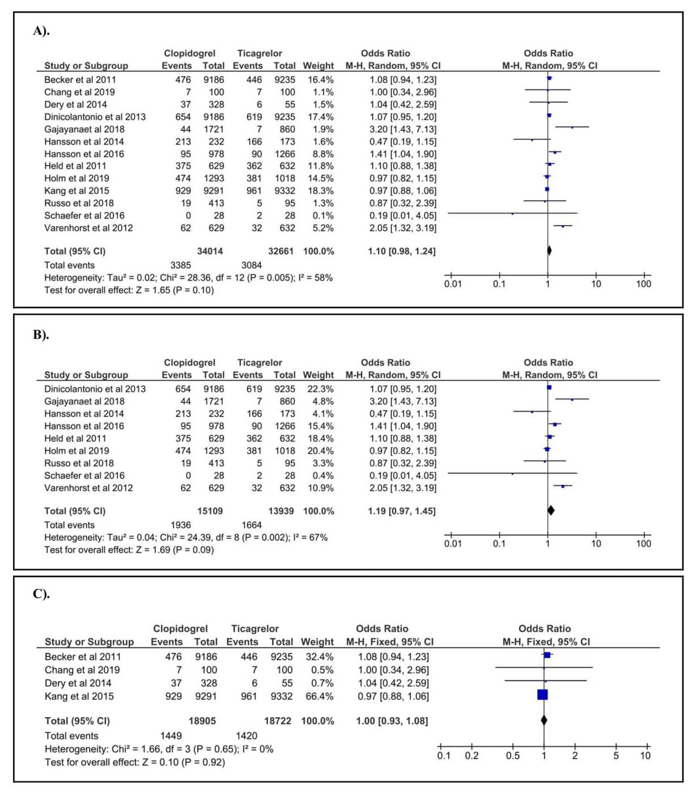 A total of 13 studies2,26–37, consisting 34,014 patients treated with clopidogrel and 32,661 patients treated with ticagrelor, were included in our study. Of those, the correlation between the use of DAPT (either clopidogrel or ticagrelor) and the risk of major bleeding was found in only three studies29,30,37. A further ten studies failed to clarify the association2,26–28,31–36. Our calculation revealed (Figure 2A) that the incidence of major bleeding was not significantly different between clopidogrel and ticagrelor (OR = 1.10, 95%CI = 0.98–1.24, p = 0.0990). Moreover, in pre-CABG sub-group, we included nine studies28–33,35–37 consisting of 15,109 patients treated with clopidogrel and 13,939 patients treated with ticagrelor. Our results found (Figure 2B) that no significant different of major bleeding incidence was observed between clopidogrel and ticagrelor (OR = 1.19, 95%CI = 0.97–1.45, p = 0.0910). While, in the post-CABG sub-group, a total of four papers2,26,27,34 consisting of 18,905 patients treated with clopidogrel and 18,722 patients treated with ticagrelor was enrolled for our analysis. Our pooled data (Figure 2C) confirmed no significant different in major bleeding incidence between clopidogrel and ticagrelor (OR = 1.00, 95%CI = 0.93–1.08, p = 0.9230). The summary of correlation and effect estimation between the risk of major bleeding and the use of different DAPT is provided in Table 2.